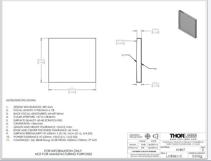 Thorlabs索雷博 LJ1836L1-C 平凸柱面透镜