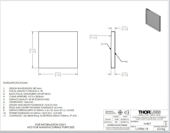 Thorlabs索雷博     LJ1836L1-B   平凸柱面透镜
