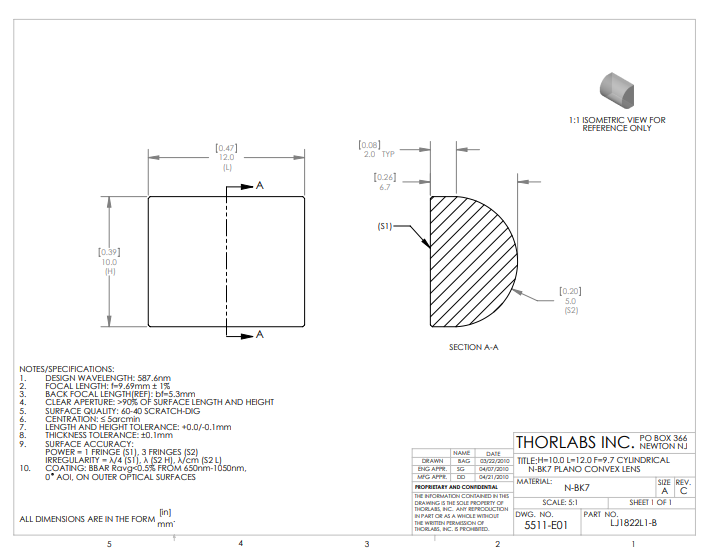 Thorlabs索雷博 LJ1822L1-B 平凸柱面透镜