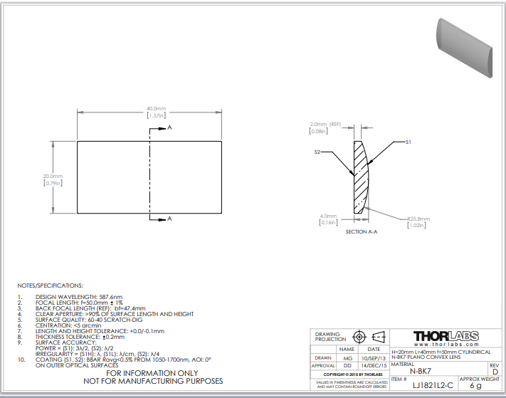 Thorlabs索雷博 LJ1821L2-C 平凸柱面透镜