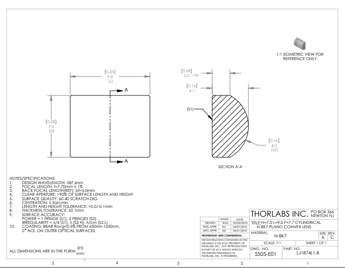 Thorlabs索雷博 LJ1874L1-B 平凸柱面透镜