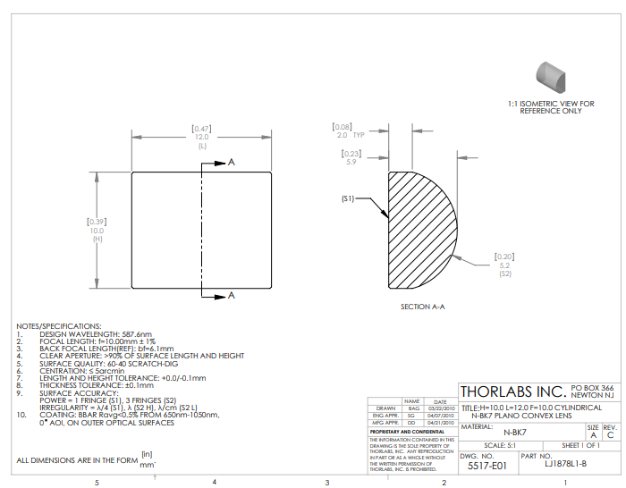 Thorlabs索雷博     LJ1878L1-B   平凸柱面透镜