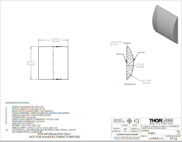 Thorlabs索雷博 LJ1895L1-C 平凸柱面透镜