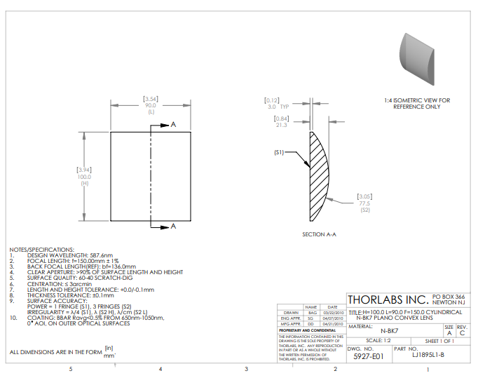 Thorlabs索雷博 LJ1895L1-B 平凸柱面透镜