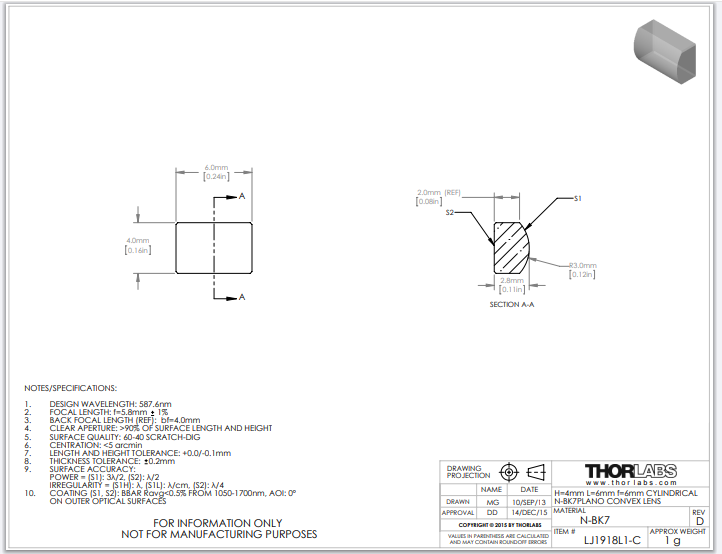 Thorlabs索雷博     LJ1918L1-C   平凸柱面透镜