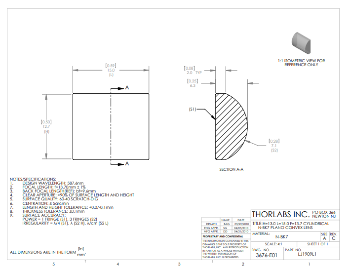 Thorlabs索雷博 LJ1909L1 平凸柱面透镜