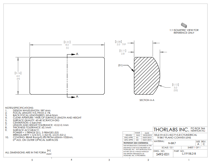 Thorlabs索雷博     LJ1918L2-B   平凸柱面透镜