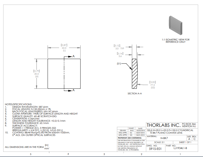 Thorlabs索雷博 LJ1934L1-B 平凸柱面透镜