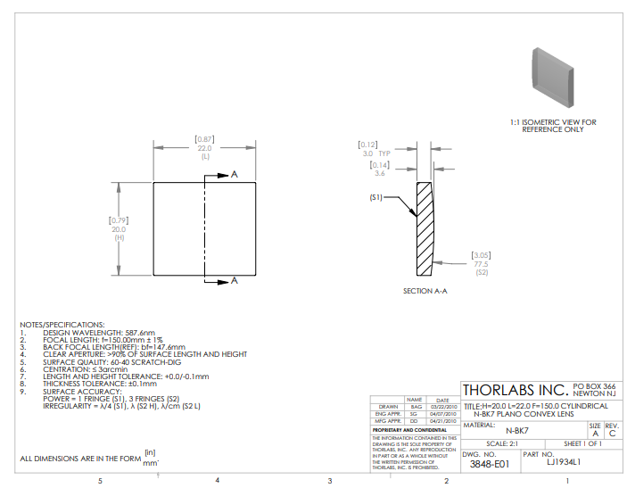 Thorlabs索雷博 LJ1934L1 平凸柱面透镜