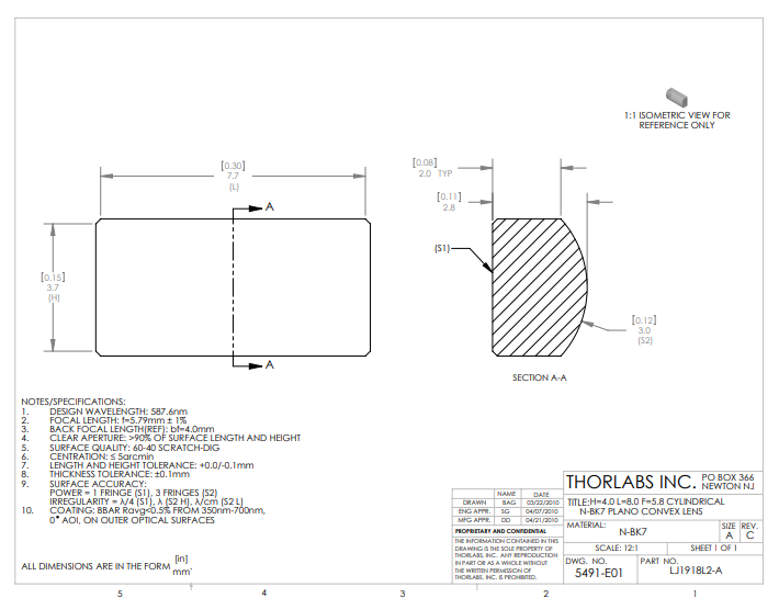 Thorlabs索雷博 LJ1918L2-A 平凸柱面透镜