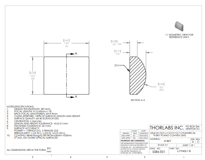 Thorlabs索雷博 LJ1942L1-B 平凸柱面透镜