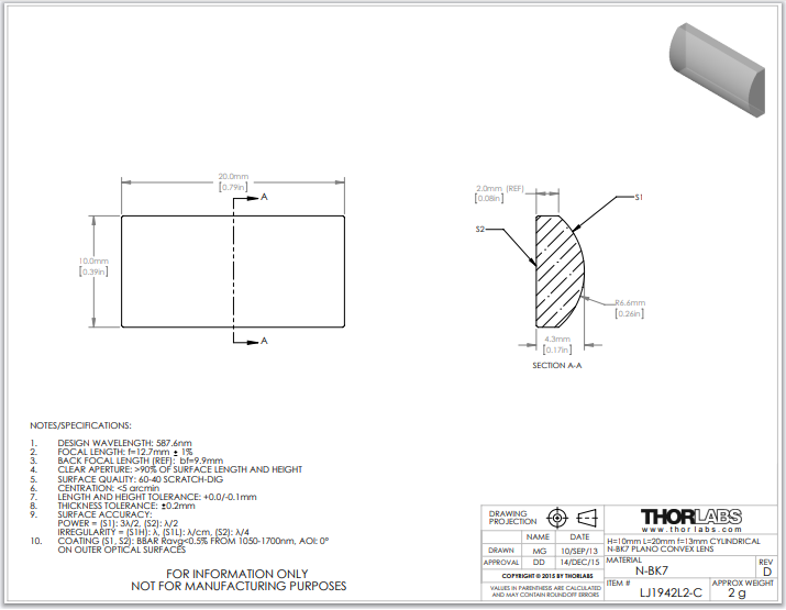 Thorlabs索雷博 LJ1942L2-C 平凸柱面透镜