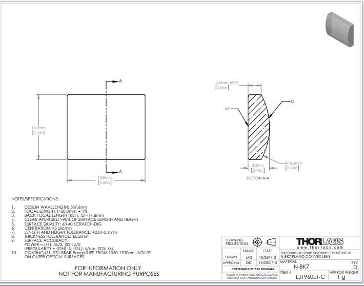 Thorlabs索雷博 LJ1960L1-C 平凸柱面透镜
