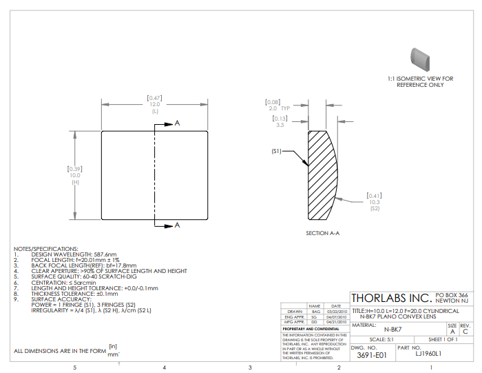 Thorlabs索雷博     LJ1960L1   平凸柱面透镜