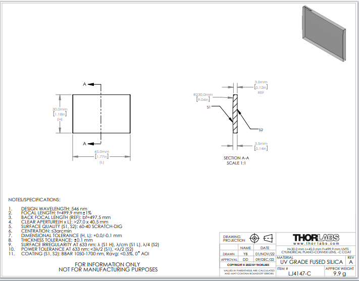 Thorlabs索雷博     LJ4147-C   平凸柱面透镜