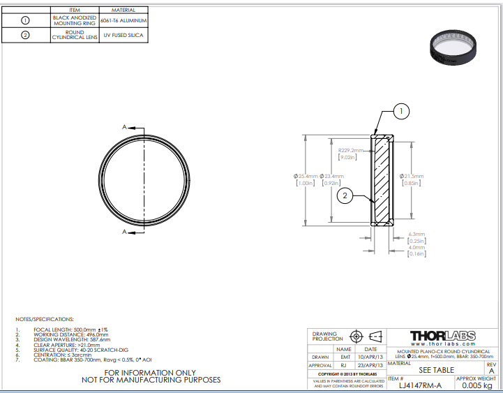 Thorlabs索雷博     LJ4147RM-A   平凸圆形柱面透镜