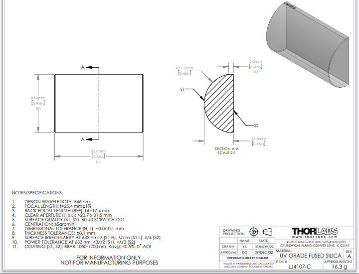 Thorlabs索雷博 LJ4107-C 平凸柱面透镜