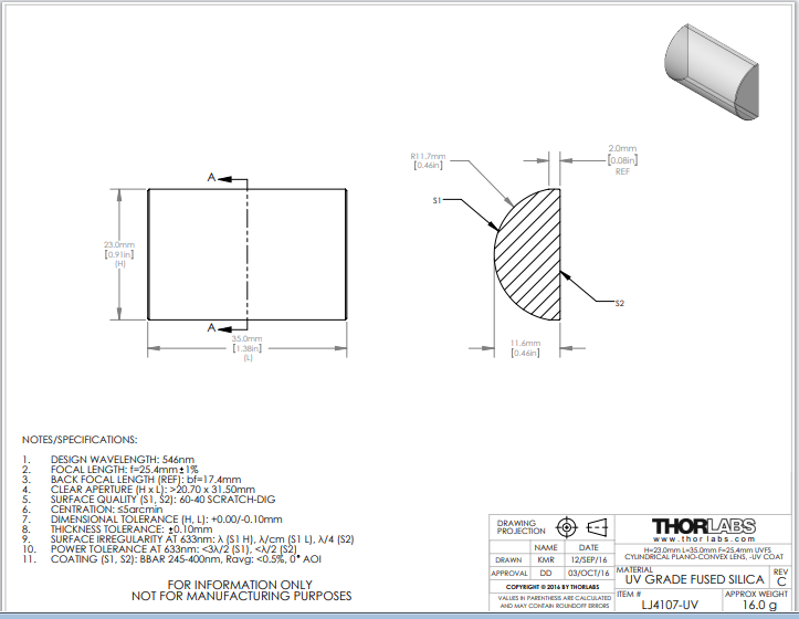 Thorlabs索雷博 LJ4107-UV 平凸柱面透镜