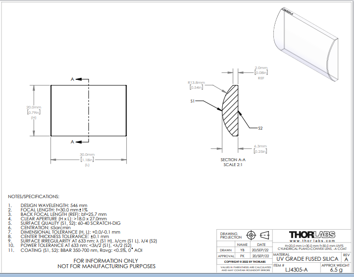 Thorlabs索雷博 LJ4305-A 平凸柱面透镜
