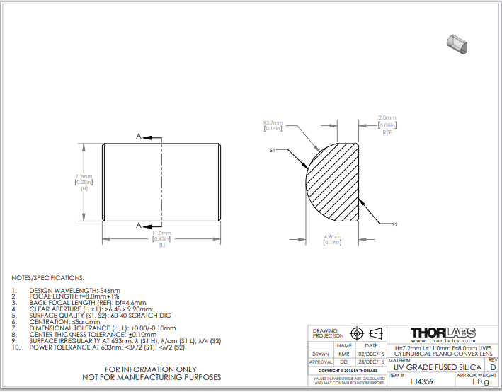 Thorlabs索雷博     LJ4359   平凸柱面透镜