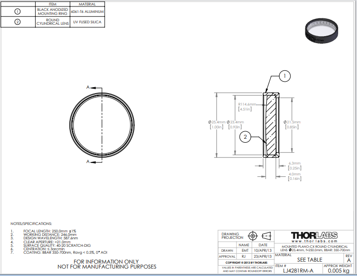 Thorlabs索雷博     LJ4281RM-A   平凸圆形柱面透镜