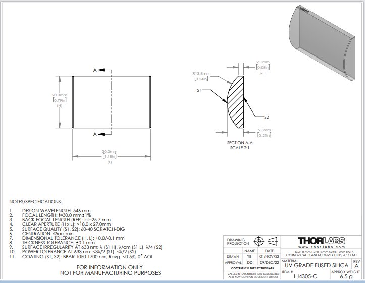 Thorlabs索雷博 LJ4305-C 平凸柱面透镜