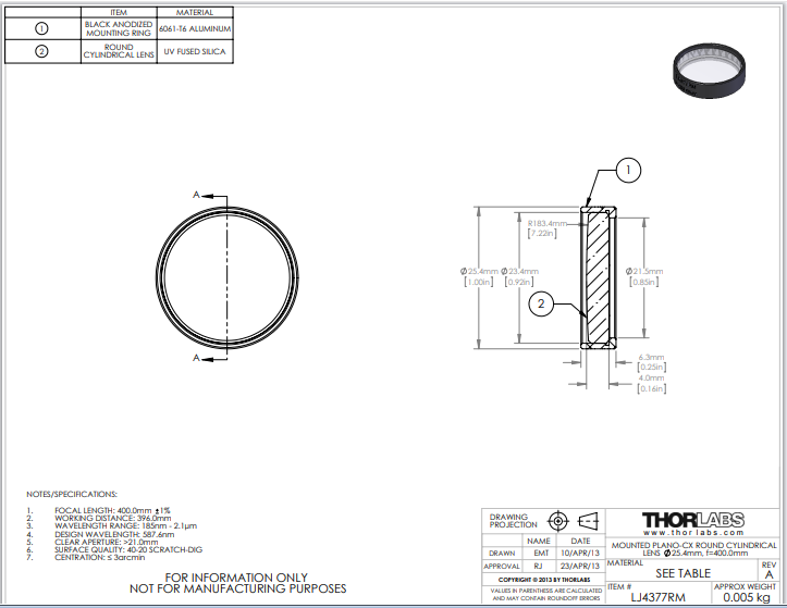 Thorlabs索雷博     LJ4377RM   平凸圆形柱面透镜