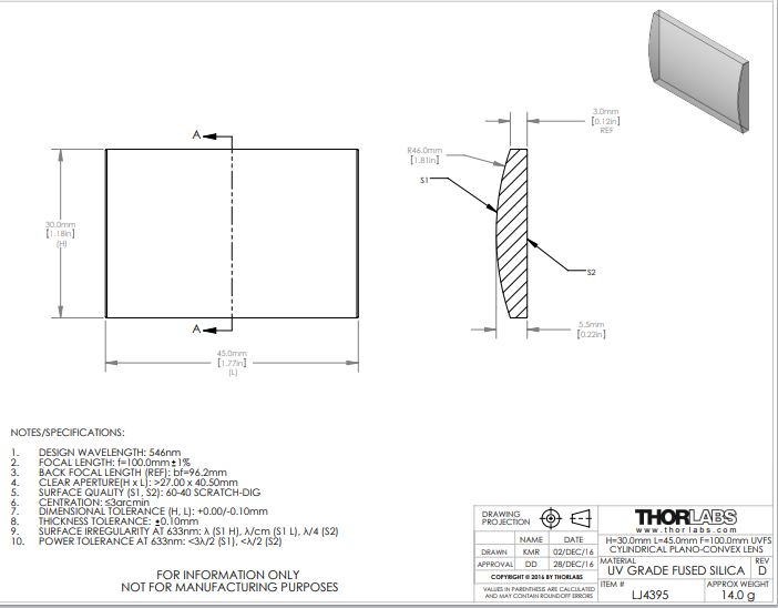 Thorlabs索雷博 LJ4395 平凸柱面透镜