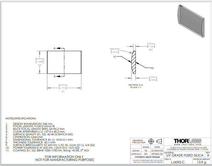 Thorlabs索雷博 LJ4395-C 平凸柱面透镜