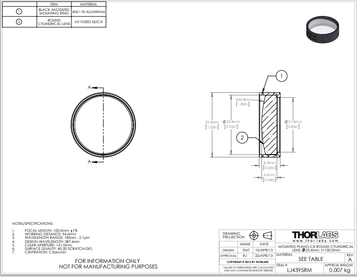 Thorlabs索雷博     LJ4395RM   平凸圆形柱面透镜