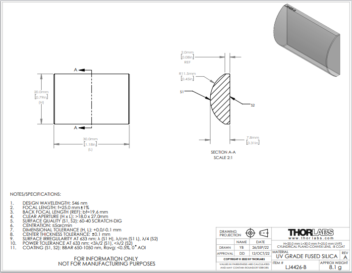 Thorlabs索雷博 LJ4426-B 平凸柱面透镜