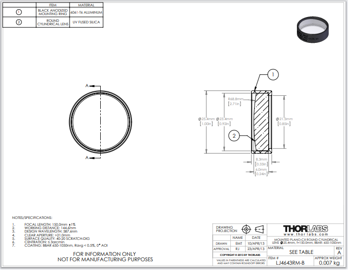 Thorlabs索雷博 LJ4643RM-B 平凸圆形柱面透镜