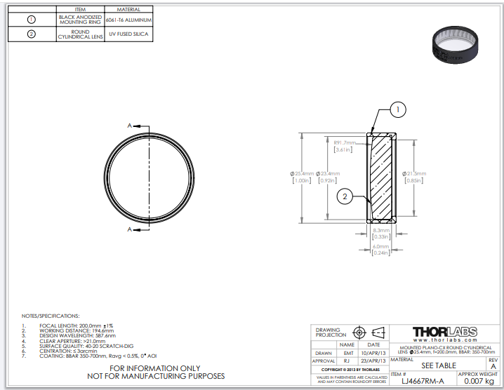 Thorlabs索雷博 LJ4667RM-A 平凸圆形柱面透镜