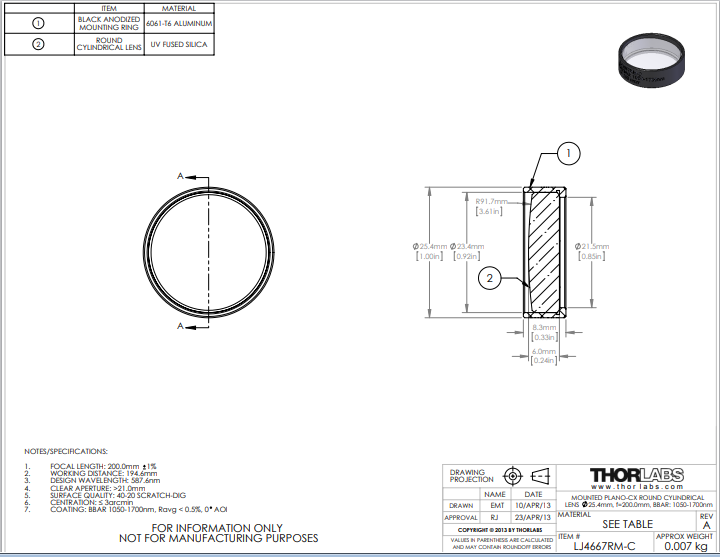 Thorlabs索雷博     LJ4667RM-C   平凸圆形柱面透镜