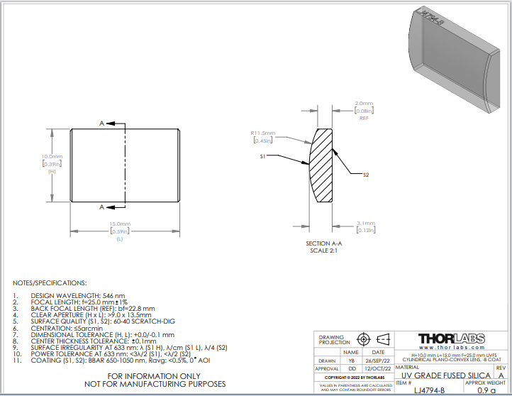 Thorlabs索雷博 LJ4794-B 平凸柱面透镜