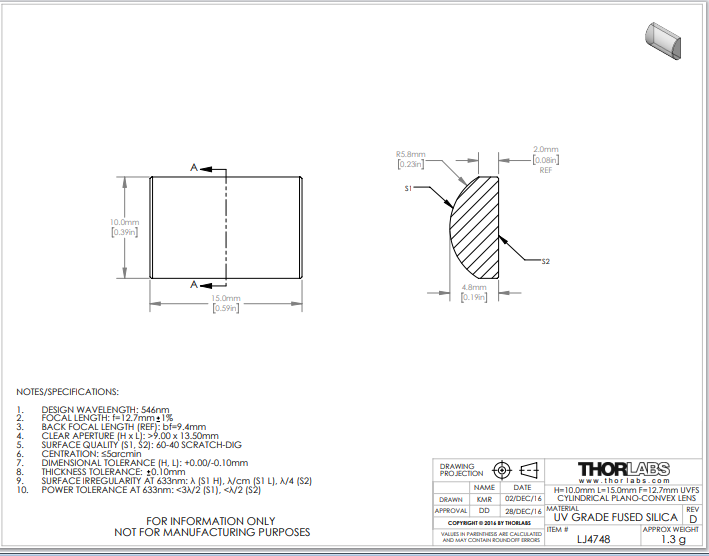Thorlabs索雷博 LJ4748 平凸柱面透镜