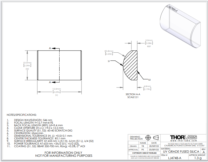 Thorlabs索雷博     LJ4748-A   平凸柱面透镜