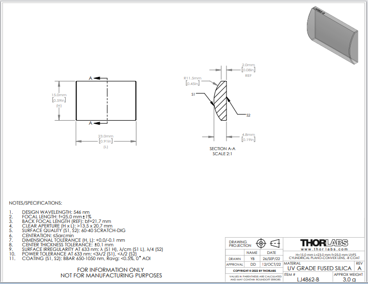 Thorlabs索雷博 LJ4862-B 平凸柱面透镜