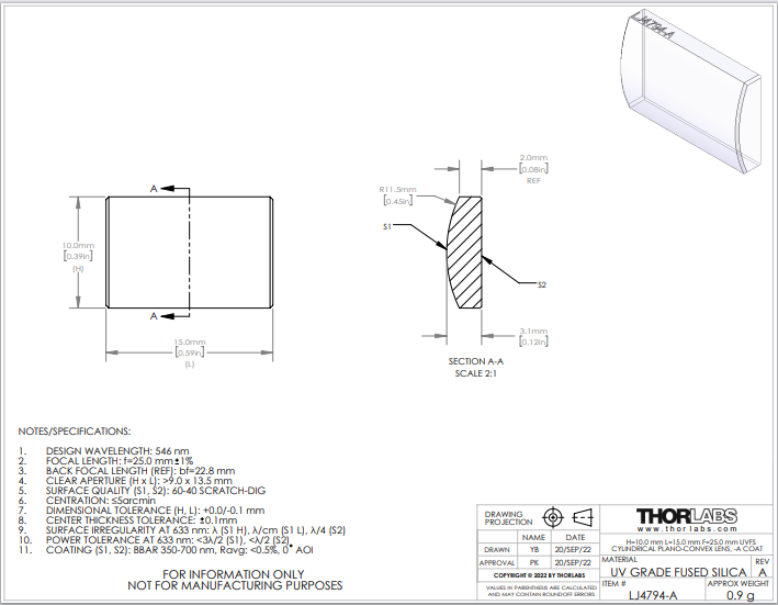 Thorlabs索雷博 LJ4794-A 平凸柱面透镜