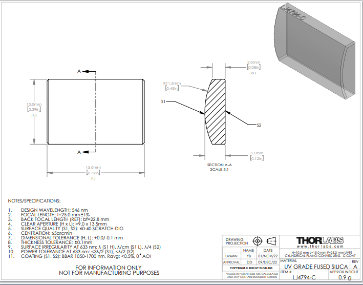 Thorlabs索雷博     LJ4794-C   平凸柱面透镜