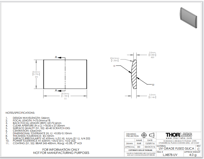 Thorlabs索雷博 LJ4878-UV 平凸柱面透镜