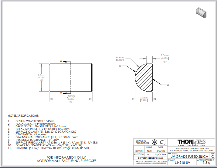 Thorlabs索雷博 LJ4918-UV 平凸柱面透镜