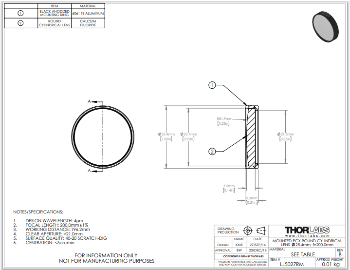 Thorlabs索雷博     LJ5027RM   平凸柱面透镜