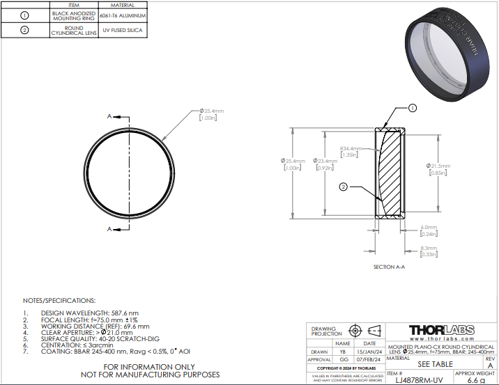 Thorlabs索雷博     LJ4878RM-UV   平凸圆形柱面透镜
