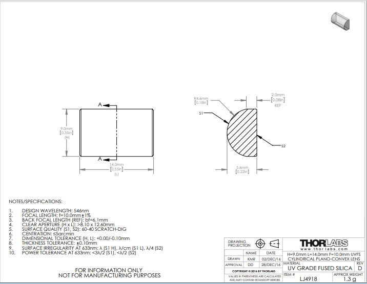Thorlabs索雷博     LJ4918   平凸柱面透镜