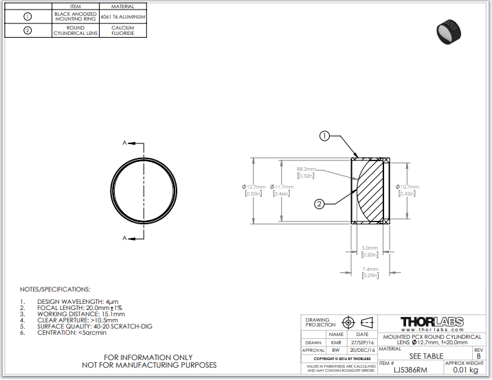 Thorlabs索雷博 LJ5386RM 平凸柱面透镜