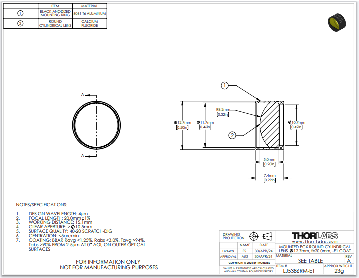 Thorlabs索雷博     LJ5386RM-E1   平凸柱面透镜