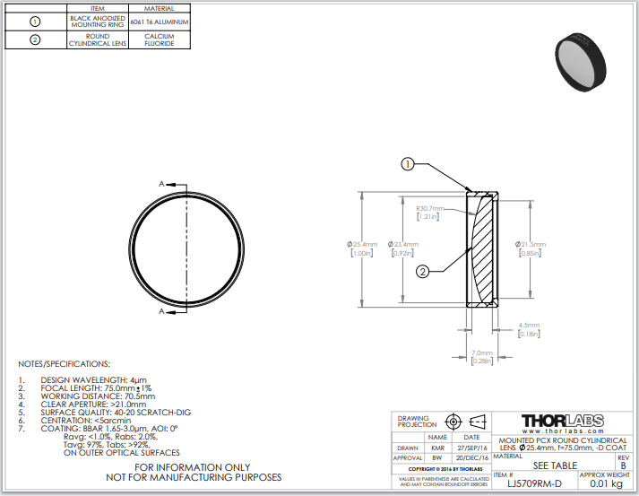Thorlabs索雷博     LJ5709RM-D   平凸柱面透镜