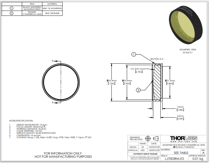 Thorlabs索雷博 LJ7003RM-E3 平凸柱面透镜
