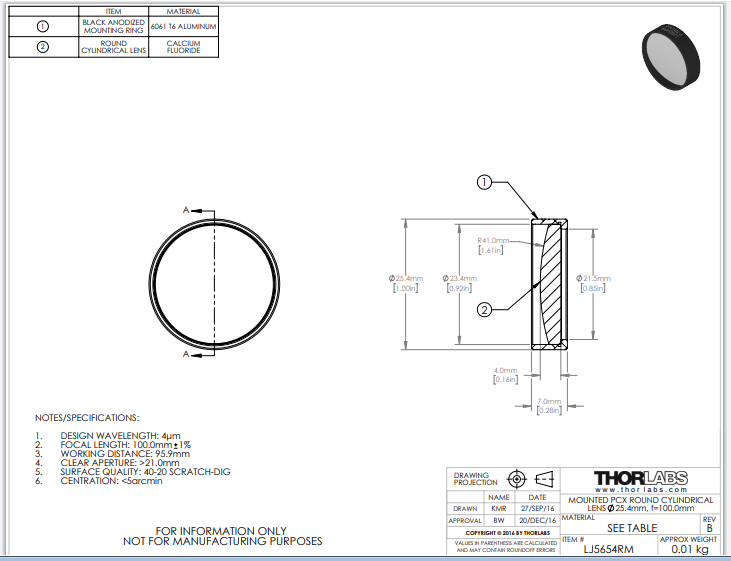 Thorlabs索雷博 LJ5654RM 平凸柱面透镜